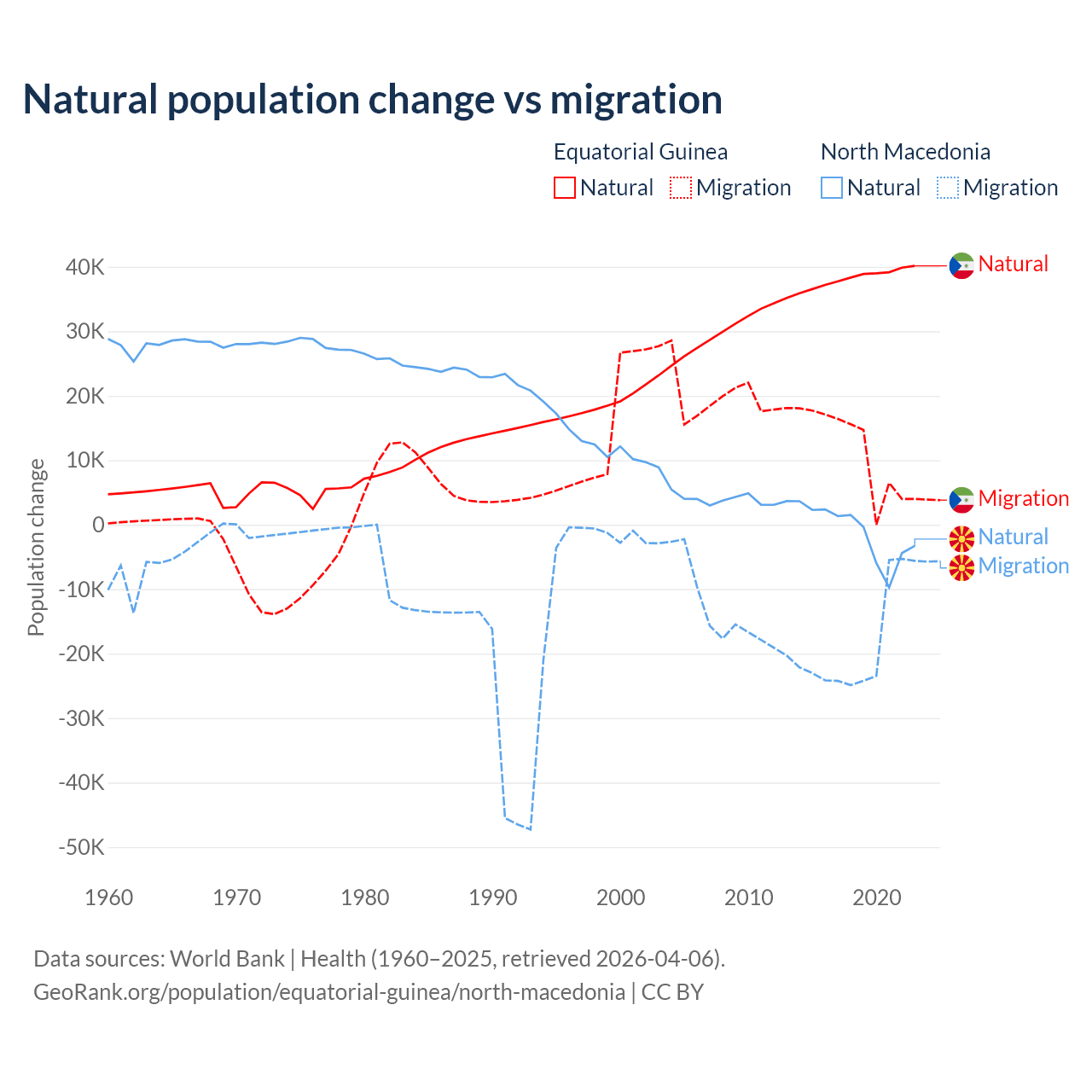Over the last 10 years, 77% of the population change in Equatorial Guinea is from natural causes (a gain of 382,745 people) and 23% is from migration (a gain of 114,024 people). In North Macedonia 6.45% is from natural causes (a loss of 12,585 people) and 93.5% is from migration (a loss of 182,429 people).