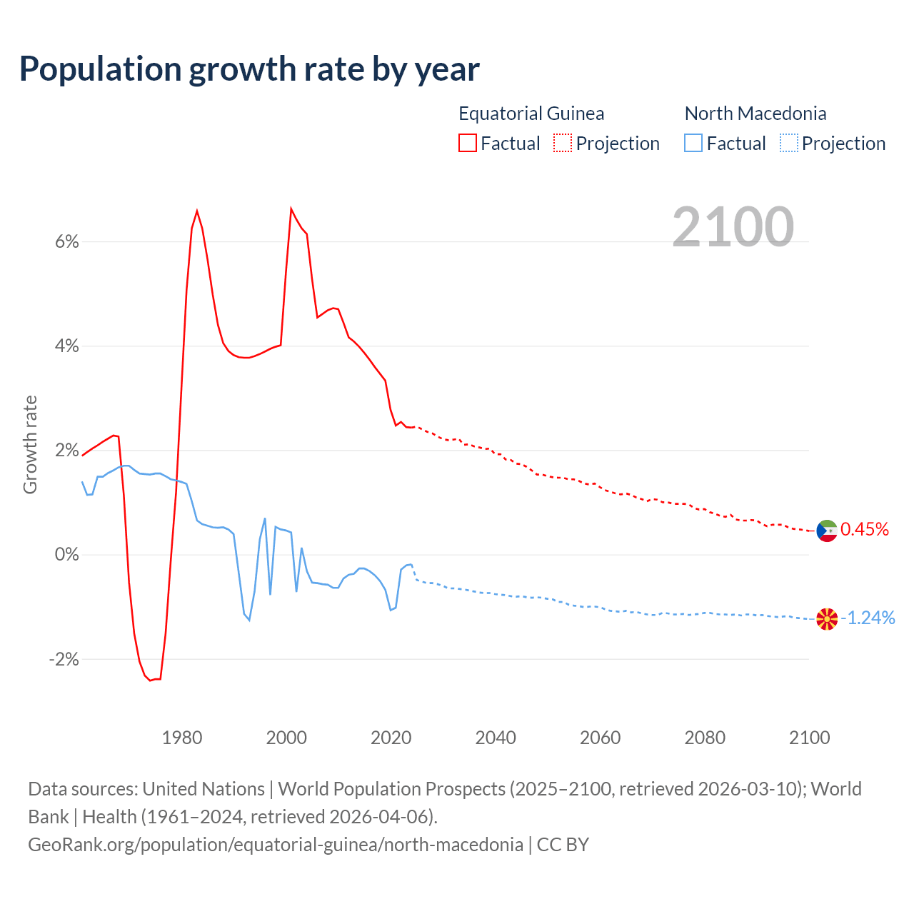 - For the last 10 years, Equatorial Guinea has had an average growth rate of +3.15% per year vs -0.48% in North Macedonia.