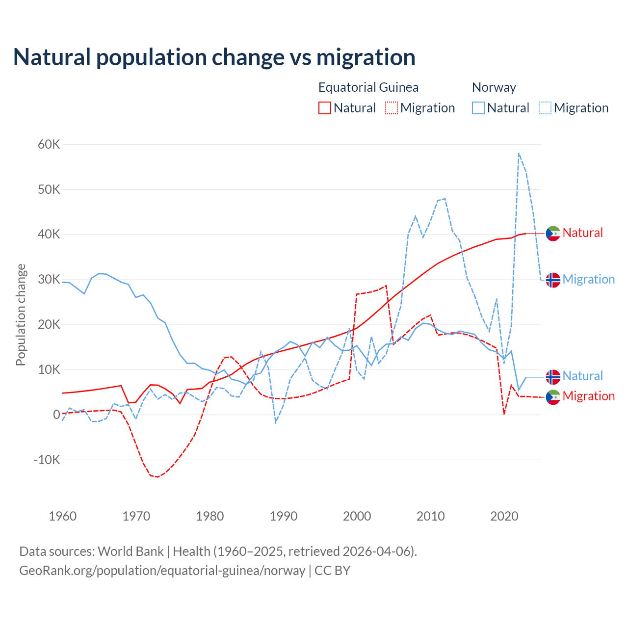 Over the last 10 years, 77% of the population change in Equatorial Guinea is from natural causes (a gain of 382,745 people) and 23% is from migration (a gain of 114,024 people). In Norway 31.3% is from natural causes (a gain of 138,699 people) and 68.7% is from migration (a gain of 303,945 people).