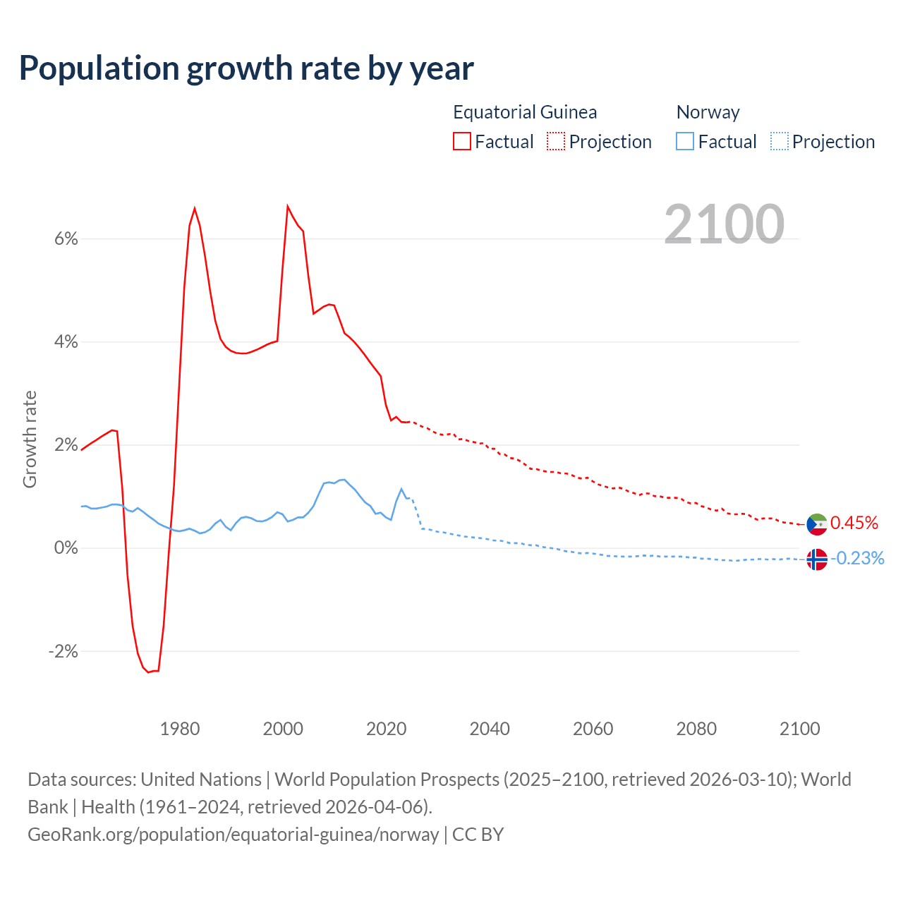 - For the last 10 years, Equatorial Guinea has had an average growth rate of +3.15% per year vs +0.85% in Norway.