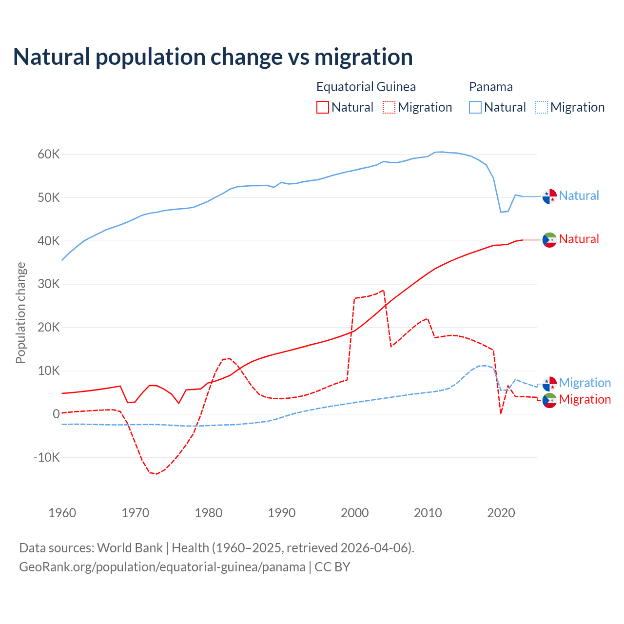 Over the last 10 years, 77% of the population change in Equatorial Guinea is from natural causes (a gain of 382,745 people) and 23% is from migration (a gain of 114,024 people). In Panama 86.5% is from natural causes (a gain of 544,211 people) and 13.5% is from migration (a gain of 84,849 people).