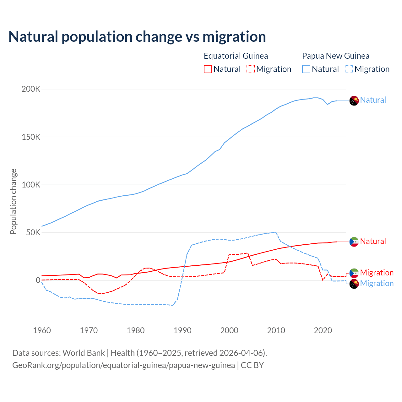 Over the last 10 years, 77% of the population change in Equatorial Guinea is from natural causes (a gain of 382,745 people) and 23% is from migration (a gain of 114,024 people). In Papua New Guinea 91% is from natural causes (a gain of 1,883,906 people) and 8.98% is from migration (a gain of 185,900 people).