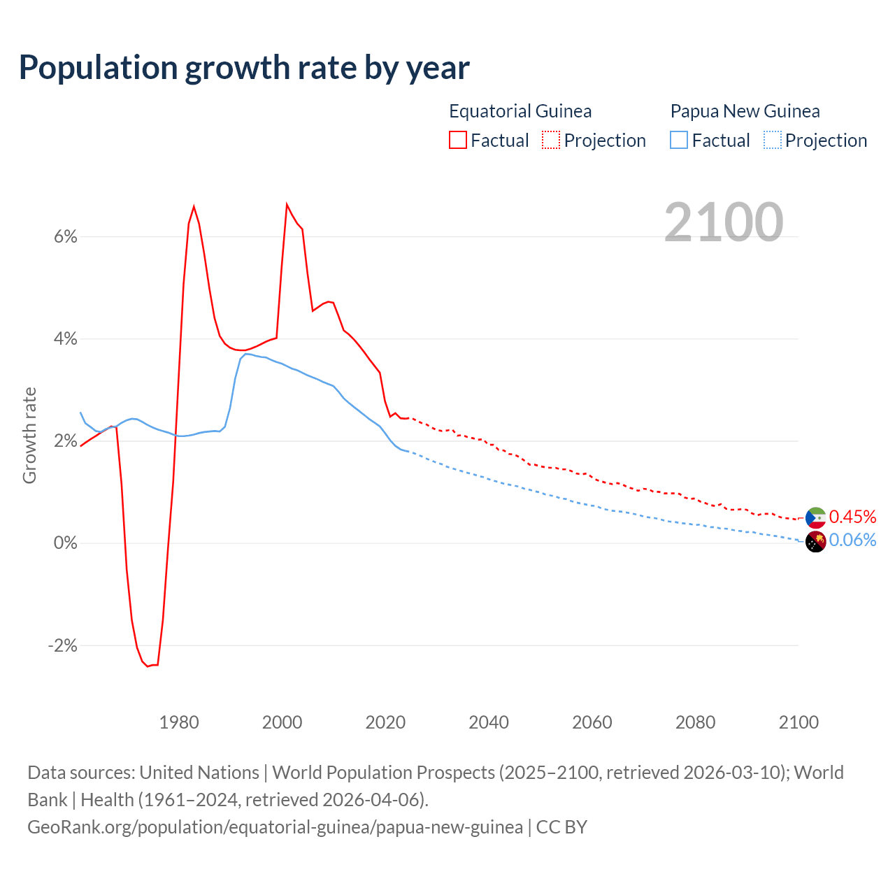 - For the last 10 years, Equatorial Guinea has had an average growth rate of +3.15% per year vs +2.23% in Papua New Guinea.
