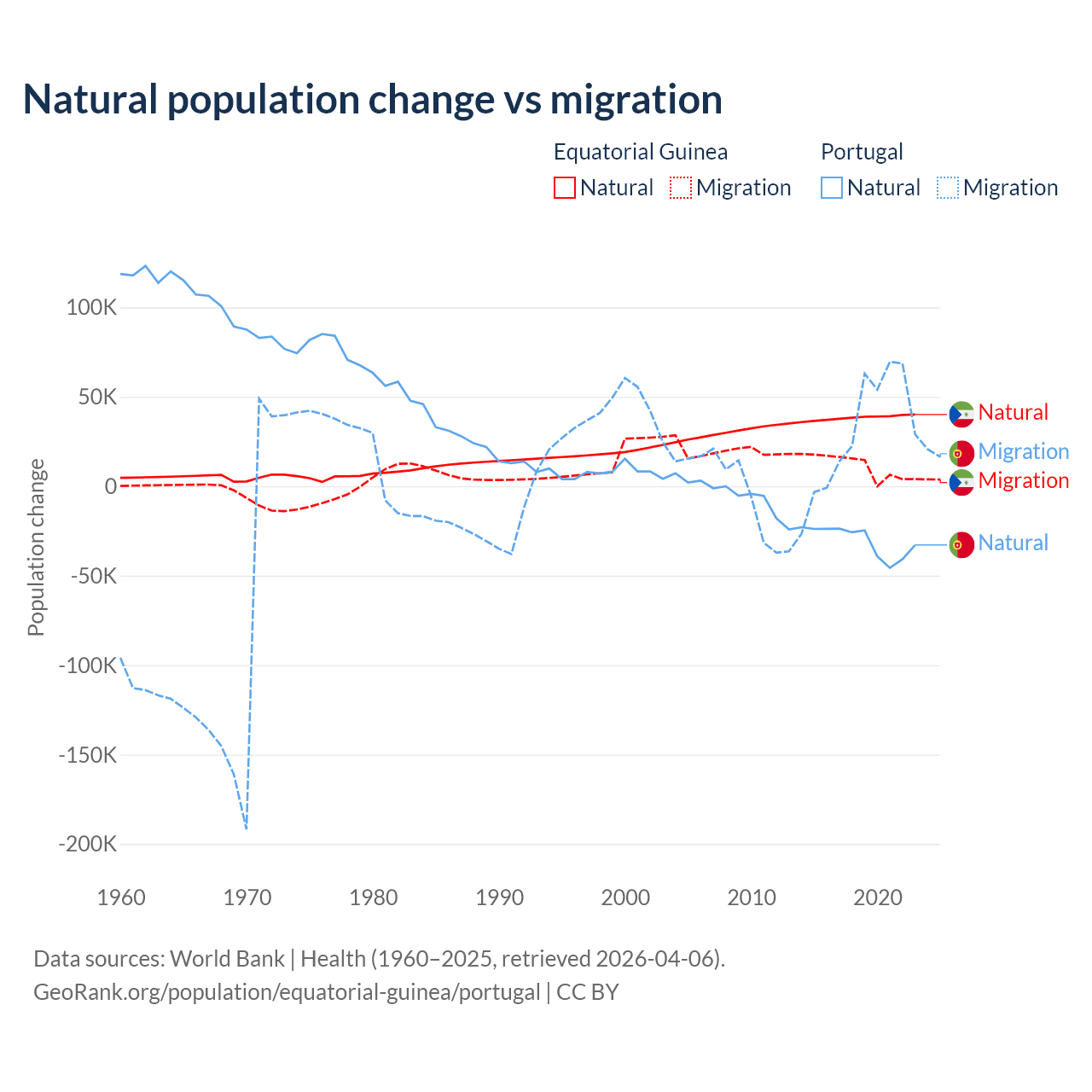 Over the last 10 years, 77% of the population change in Equatorial Guinea is from natural causes (a gain of 382,745 people) and 23% is from migration (a gain of 114,024 people). In Portugal 51% is from natural causes (a loss of 302,748 people) and 49% is from migration (a gain of 290,554 people).