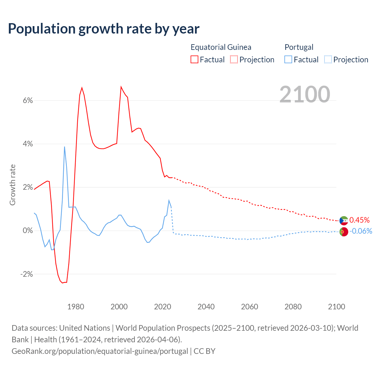 - For the last 10 years, Equatorial Guinea has had an average growth rate of +3.15% per year vs +0.21% in Portugal.