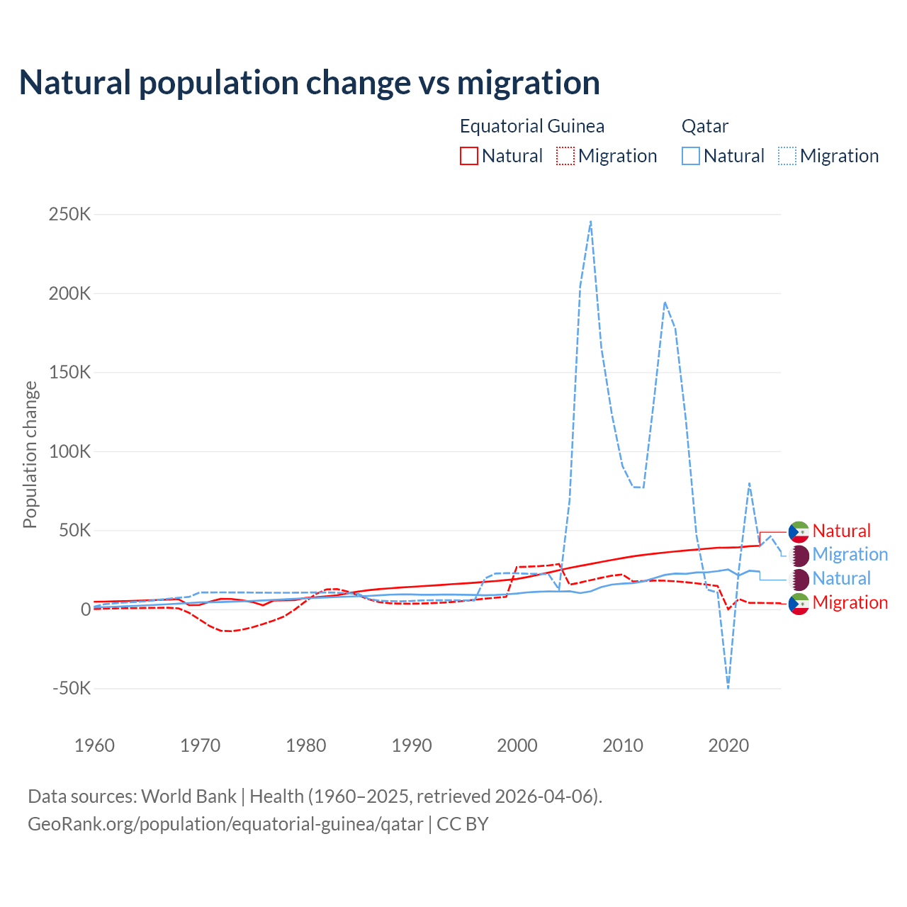 Over the last 10 years, 77% of the population change in Equatorial Guinea is from natural causes (a gain of 382,745 people) and 23% is from migration (a gain of 114,024 people). In Qatar 26.1% is from natural causes (a gain of 232,009 people) and 73.9% is from migration (a gain of 655,712 people).