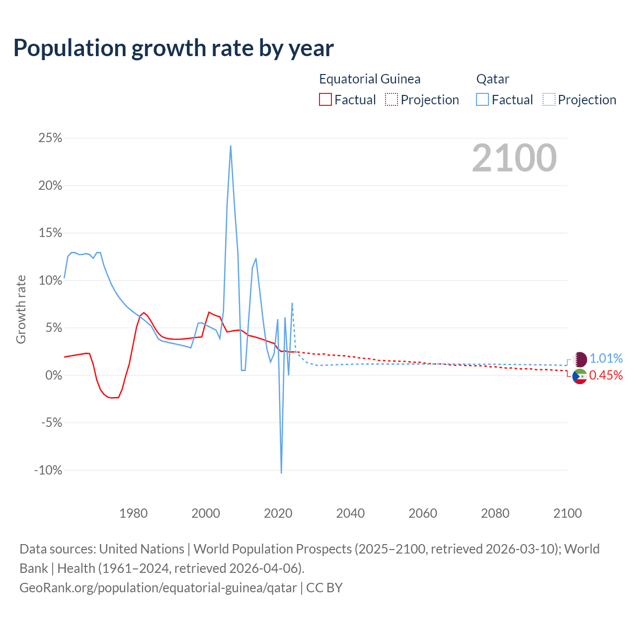 - For the last 10 years, Equatorial Guinea has had an average growth rate of +3.15% per year vs +3.86% in Qatar.