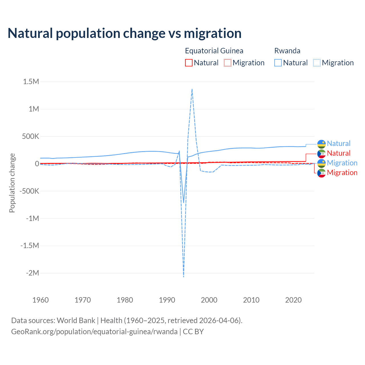 Over the last 10 years, 77% of the population change in Equatorial Guinea is from natural causes (a gain of 382,745 people) and 23% is from migration (a gain of 114,024 people). In Rwanda 93.8% is from natural causes (a gain of 3,081,296 people) and 6.18% is from migration (a loss of 203,035 people).