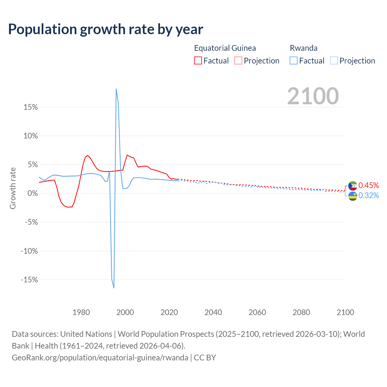 - For the last 10 years, Equatorial Guinea has had an average growth rate of +3.15% per year vs +2.31% in Rwanda.