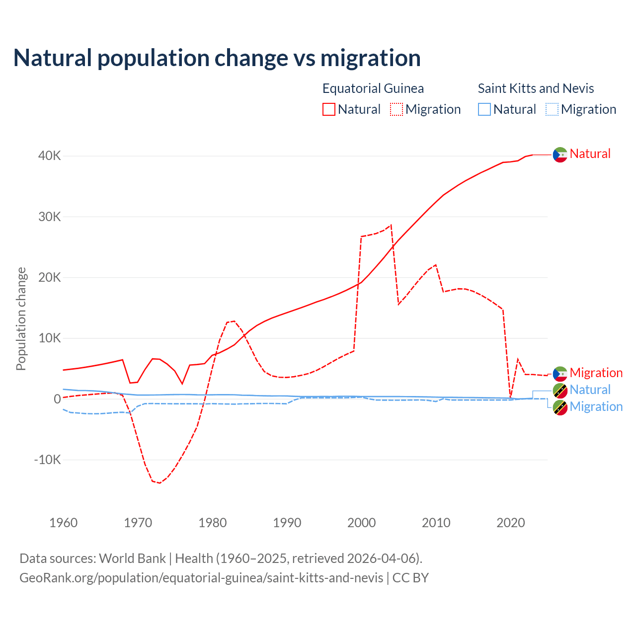 Over the last 10 years, 77% of the population change in Equatorial Guinea is from natural causes (a gain of 382,745 people) and 23% is from migration (a gain of 114,024 people). In Saint Kitts and Nevis 44.9% is from natural causes (a gain of 1,225 people) and 55.1% is from migration (a loss of 1,506 people).