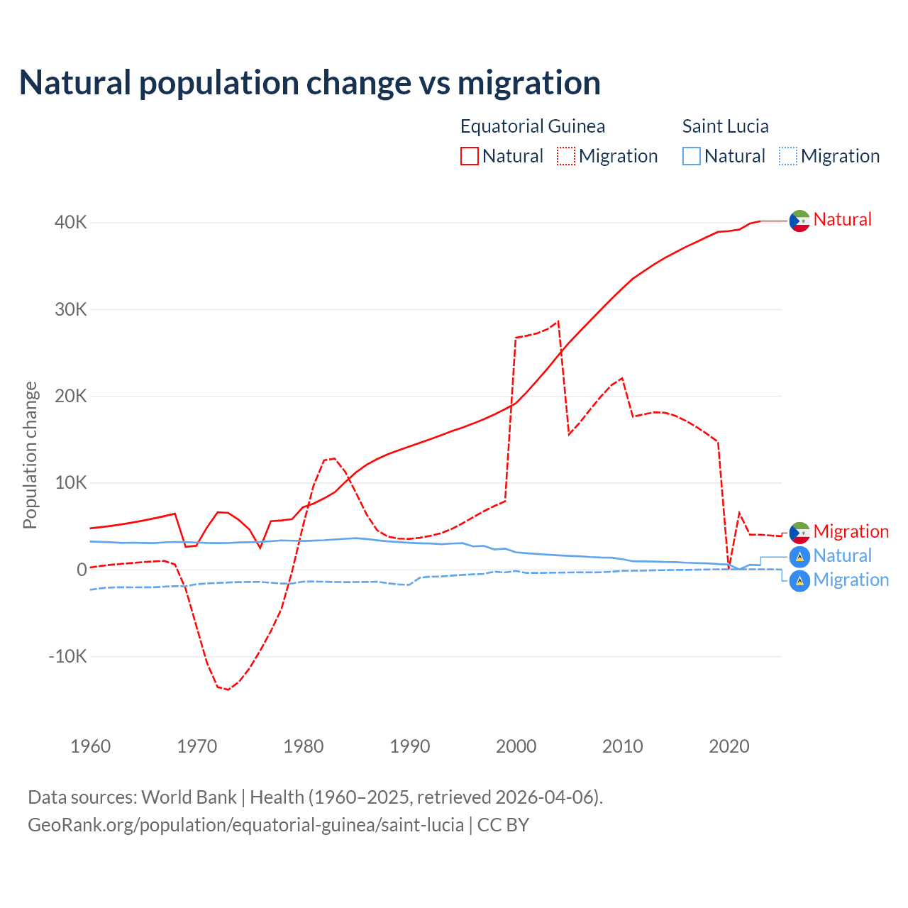 Over the last 10 years, 77% of the population change in Equatorial Guinea is from natural causes (a gain of 382,745 people) and 23% is from migration (a gain of 114,024 people). In Saint Lucia 95.7% is from natural causes (a gain of 6,039 people) and 4.31% is from migration (a loss of 272 people).
