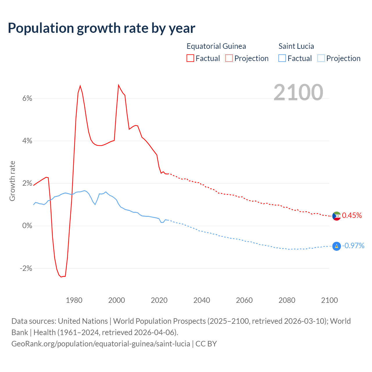 - For the last 10 years, Equatorial Guinea has had an average growth rate of +3.15% per year vs +0.33% in Saint Lucia.