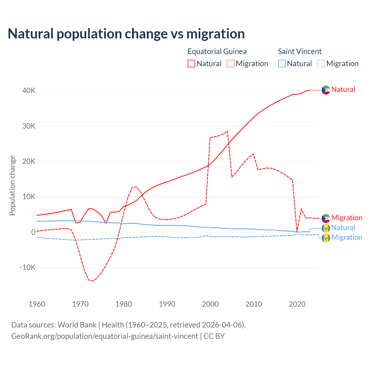Over the last 10 years, 77% of the population change in Equatorial Guinea is from natural causes (a gain of 382,745 people) and 23% is from migration (a gain of 114,024 people). In Saint Vincent 21.2% is from natural causes (a gain of 2,525 people) and 78.8% is from migration (a loss of 9,393 people).