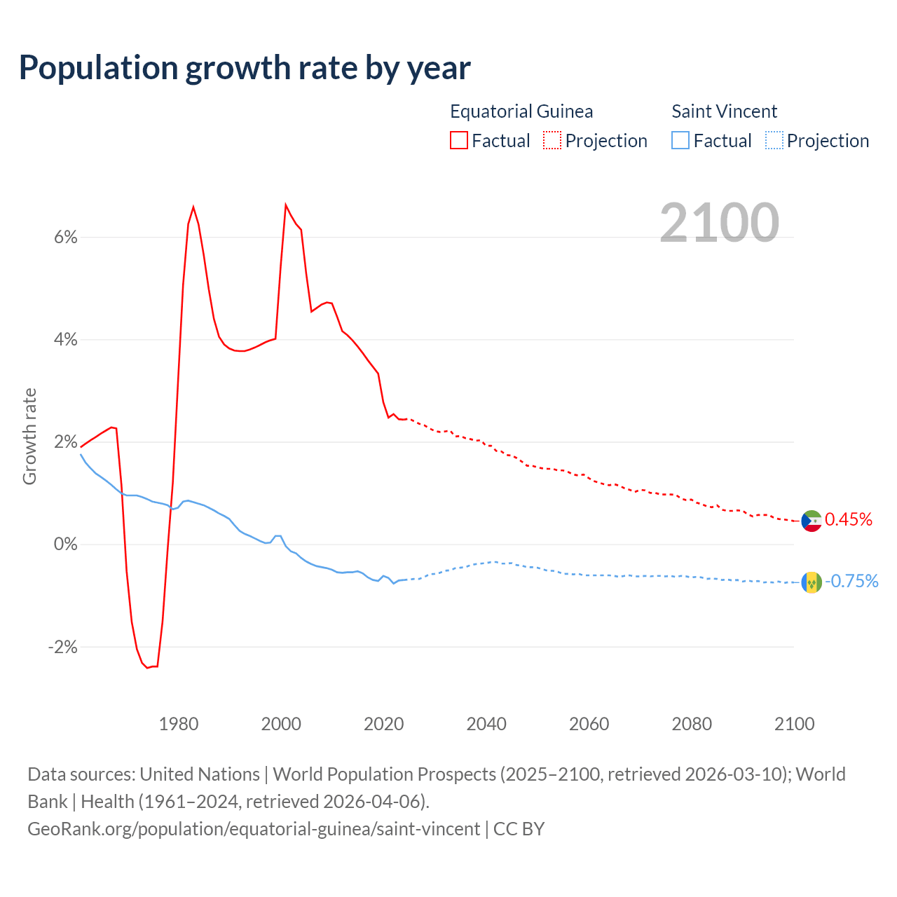 - For the last 10 years, Equatorial Guinea has had an average growth rate of +3.15% per year vs -0.65% in Saint Vincent.