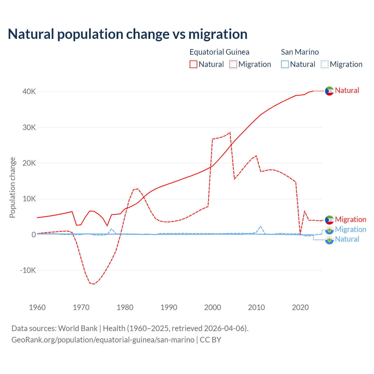 Over the last 10 years, 77% of the population change in Equatorial Guinea is from natural causes (a gain of 382,745 people) and 23% is from migration (a gain of 114,024 people). In San Marino 40.9% is from natural causes (a loss of 358 people) and 59.1% is from migration (a gain of 517 people).