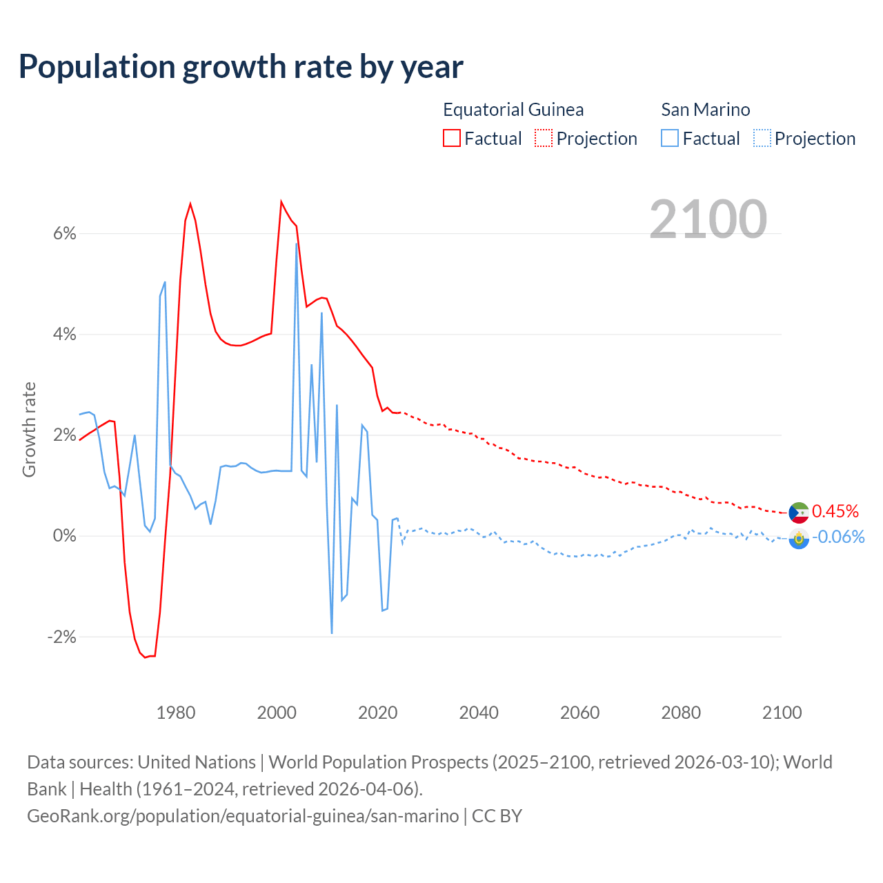 Data sources: World Bank | Health (1960–2024, retrieved 2026-04-06); United Nations | World Population Prospects (1960–2026, retrieved 2026-03-10); U.S. Census Bureau (1960–2025, retrieved 2026-02-08); Central Intelligence Agency (CIA) (2000–2019, retrieved 2026-02-20).