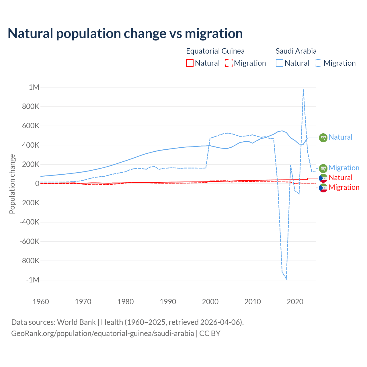 Over the last 10 years, 77% of the population change in Equatorial Guinea is from natural causes (a gain of 382,745 people) and 23% is from migration (a gain of 114,024 people). In Saudi Arabia 93.9% is from natural causes (a gain of 4,829,562 people) and 6.05% is from migration (a gain of 311,209 people).