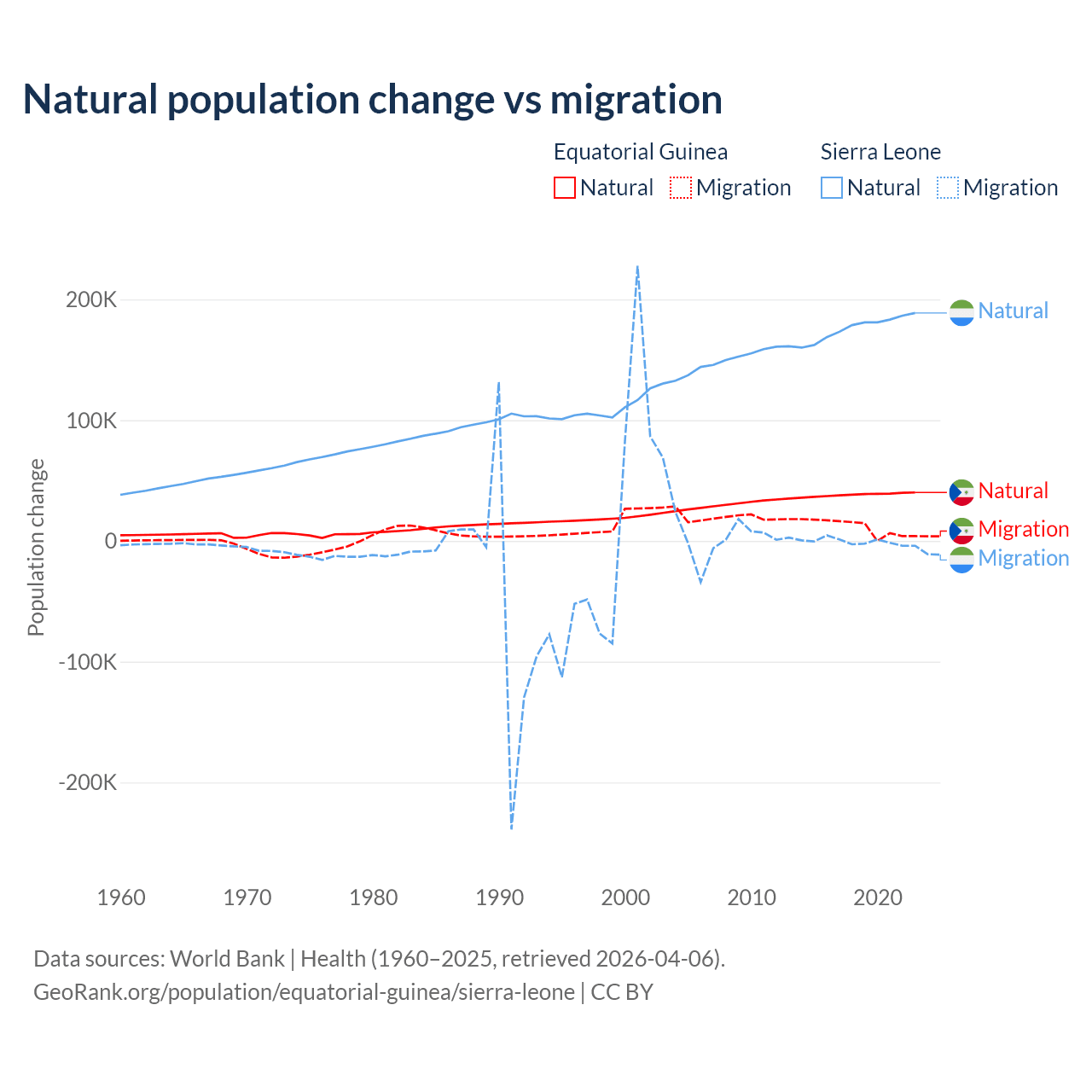 Over the last 10 years, 77% of the population change in Equatorial Guinea is from natural causes (a gain of 382,745 people) and 23% is from migration (a gain of 114,024 people). In Sierra Leone 99.6% is from natural causes (a gain of 1,764,049 people) and 0.41% is from migration (a loss of 7,211 people).