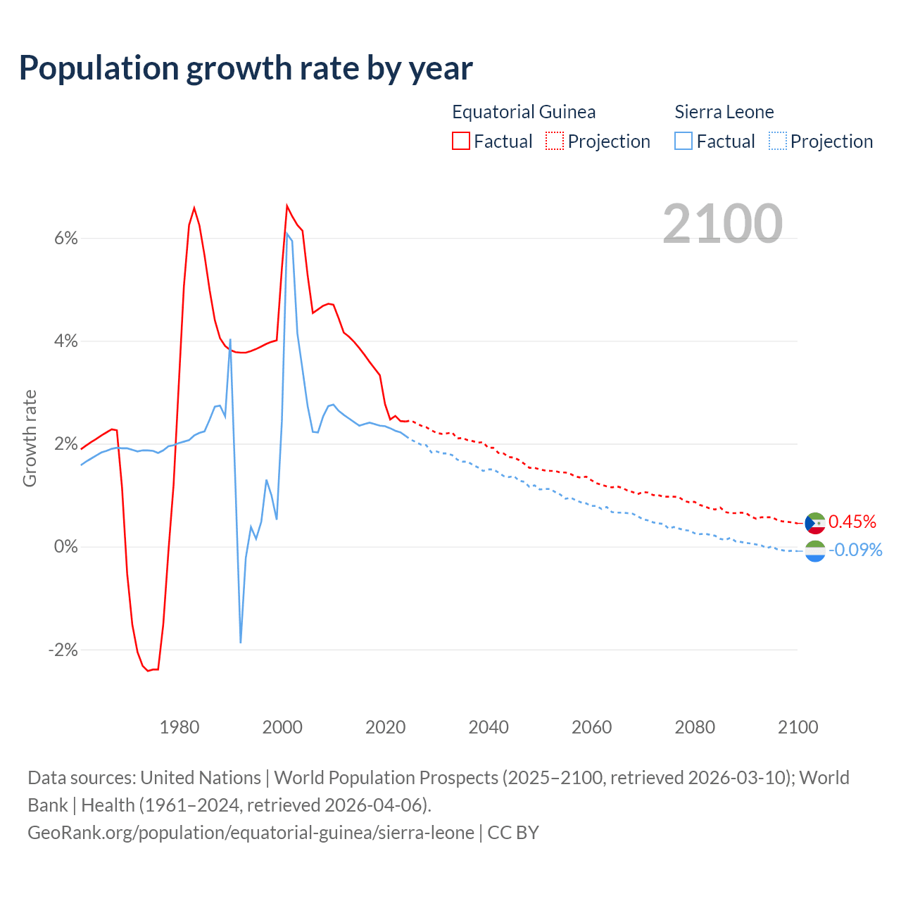 - For the last 10 years, Equatorial Guinea has had an average growth rate of +3.15% per year vs +2.32% in Sierra Leone.