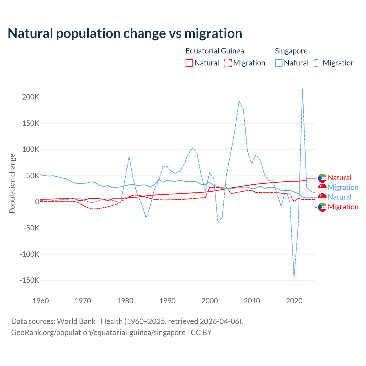Over the last 10 years, 77% of the population change in Equatorial Guinea is from natural causes (a gain of 382,745 people) and 23% is from migration (a gain of 114,024 people). In Singapore 54.8% is from natural causes (a gain of 195,953 people) and 45.2% is from migration (a gain of 161,805 people).