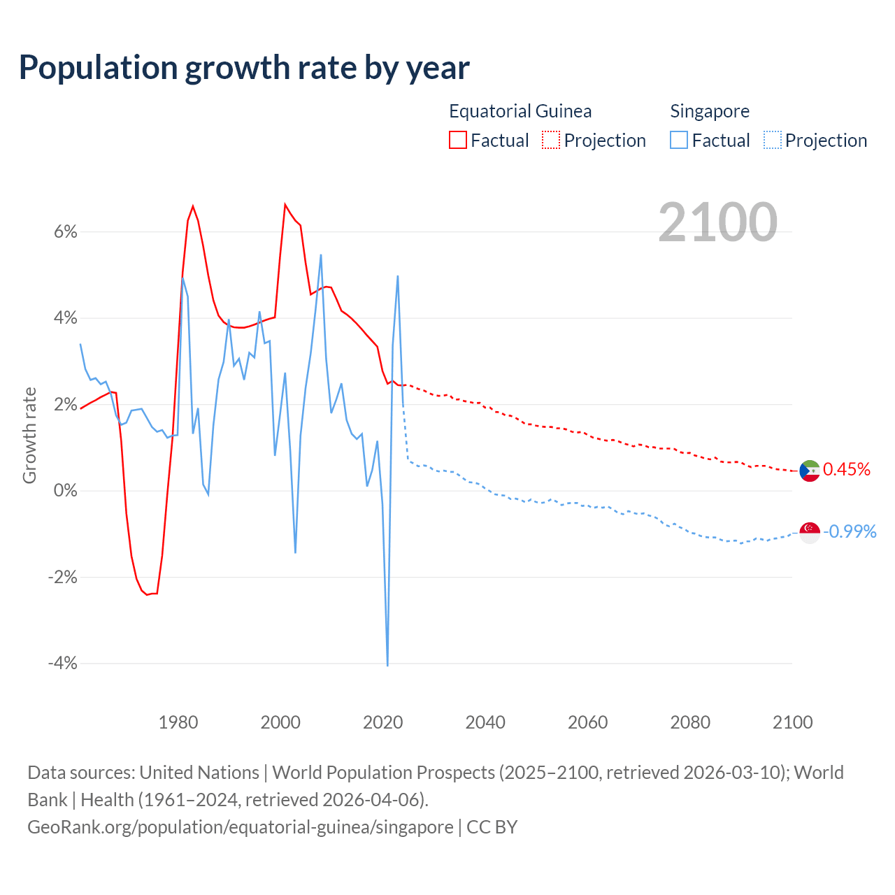 - For the last 10 years, Equatorial Guinea has had an average growth rate of +3.15% per year vs +1.04% in Singapore.