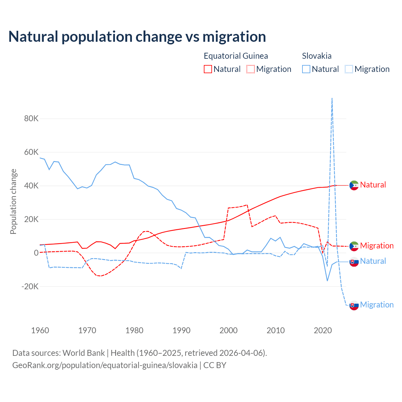 Over the last 10 years, 77% of the population change in Equatorial Guinea is from natural causes (a gain of 382,745 people) and 23% is from migration (a gain of 114,024 people). In Slovakia 7.47% is from natural causes (a loss of 8,728 people) and 92.5% is from migration (a gain of 108,156 people).