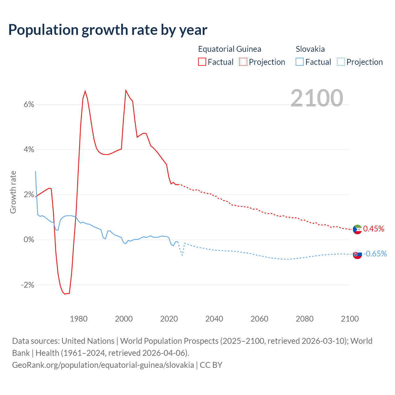 - For the last 10 years, Equatorial Guinea has had an average growth rate of +3.15% per year vs +0.01% in Slovakia.