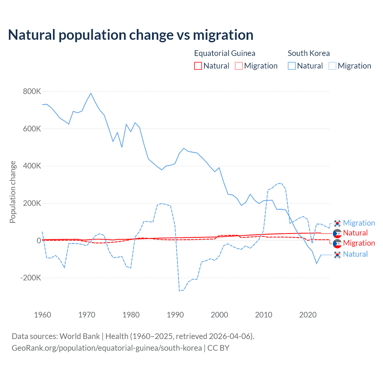 Over the last 10 years, 77% of the population change in Equatorial Guinea is from natural causes (a gain of 382,745 people) and 23% is from migration (a gain of 114,024 people). In South Korea 17.6% is from natural causes (a gain of 277,215 people) and 82.4% is from migration (a gain of 1,298,356 people).