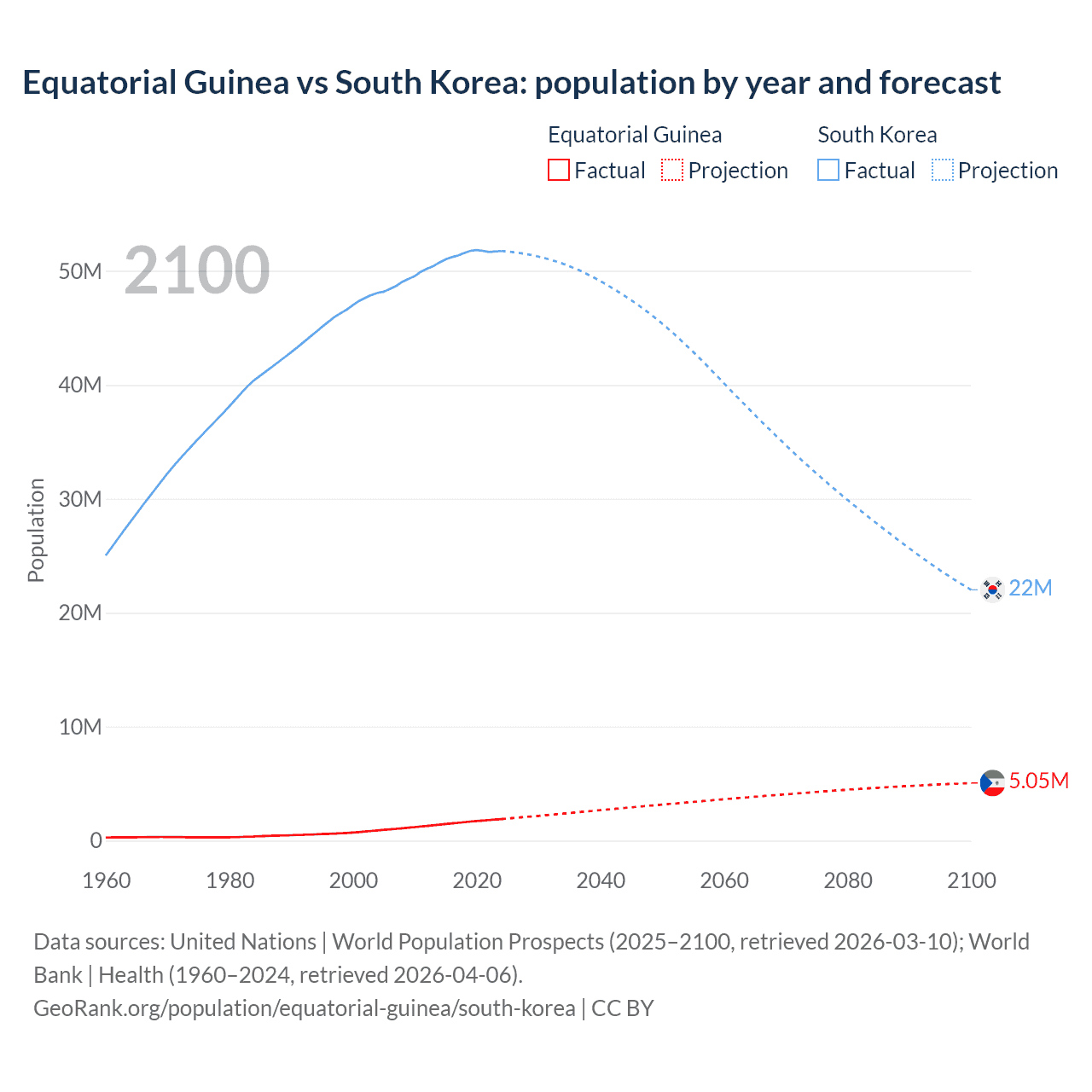 The latest officially reported population of Equatorial Guinea was 1,892,516 in 2024 vs 51,751,065 people in South Korea in 2024. In 2026, based on the adjusted UN estimation, the current Equatorial Guinea's population is 1,998,075 people compared to 51,649,918 in South Korea.