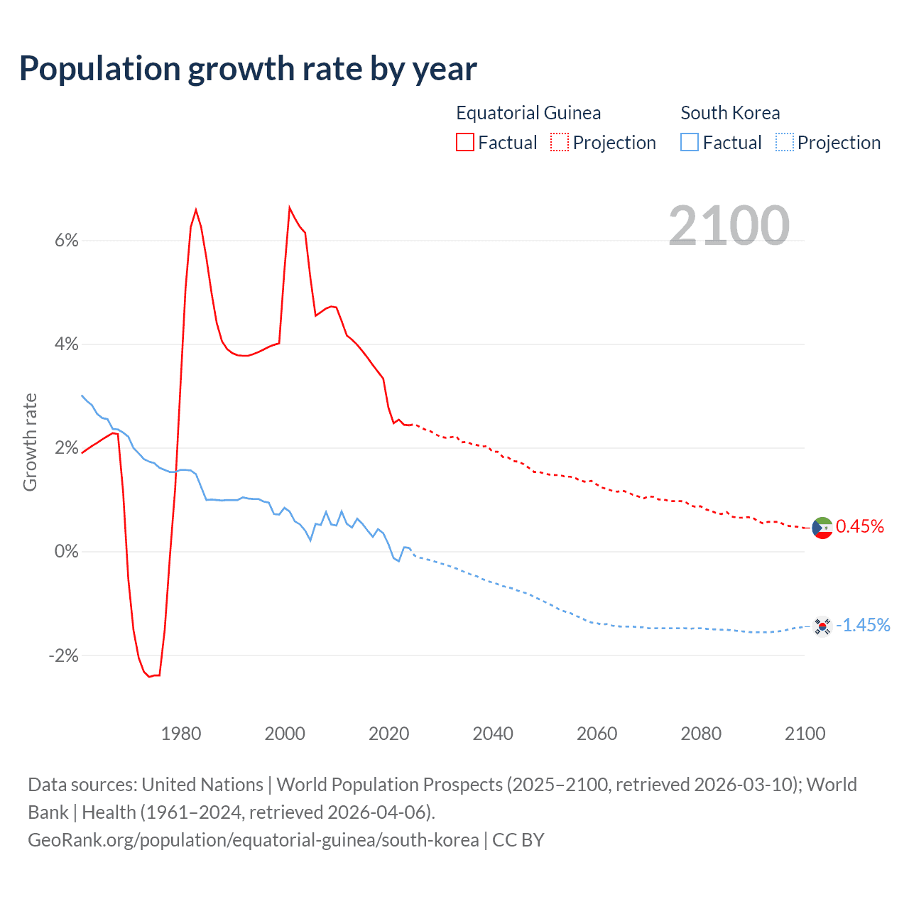 - For the last 10 years, Equatorial Guinea has had an average growth rate of +3.15% per year vs +0.24% in South Korea.