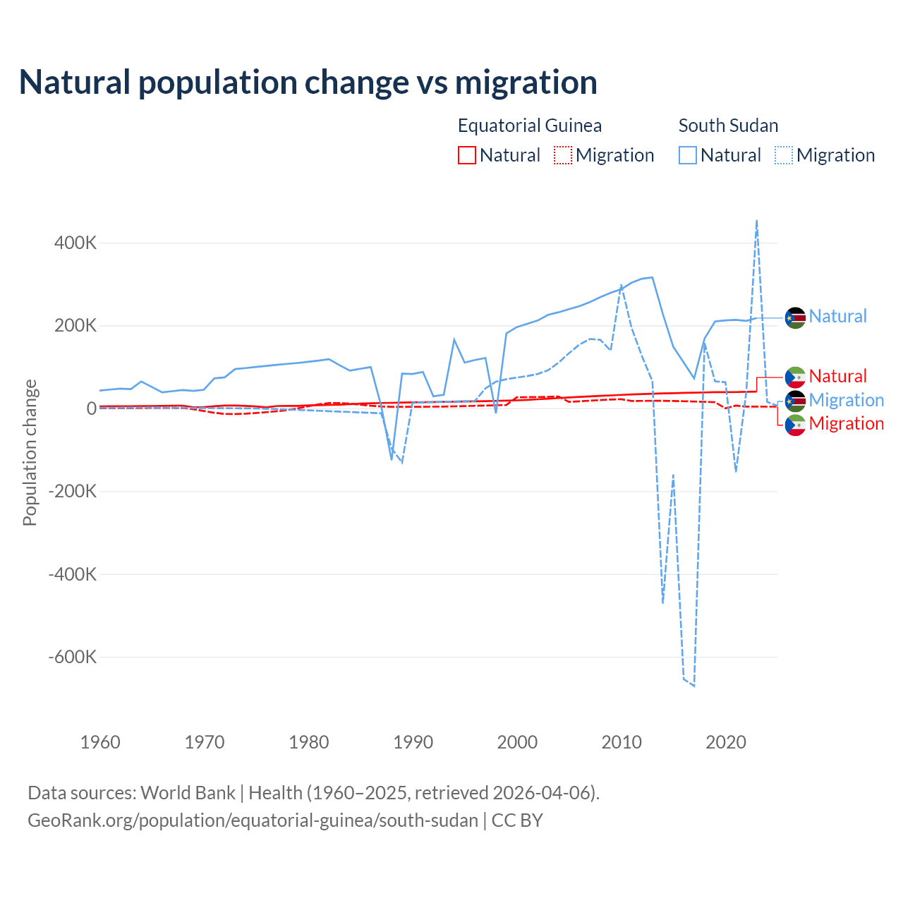 Over the last 10 years, 77% of the population change in Equatorial Guinea is from natural causes (a gain of 382,745 people) and 23% is from migration (a gain of 114,024 people). In South Sudan 57.4% is from natural causes (a gain of 1,792,135 people) and 42.6% is from migration (a loss of 1,329,606 people).
