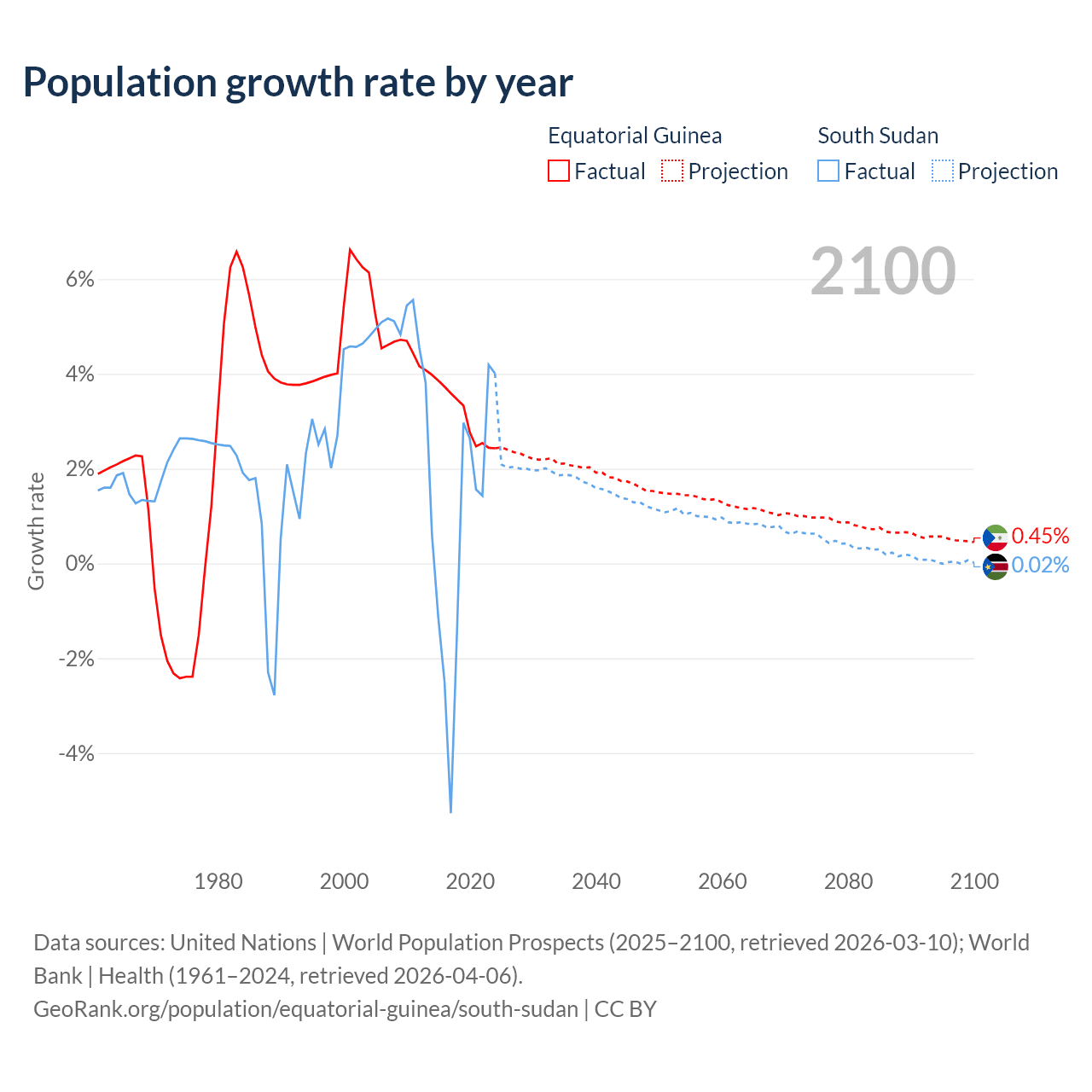 - For the last 10 years, Equatorial Guinea has had an average growth rate of +3.15% per year vs +0.65% in South Sudan.