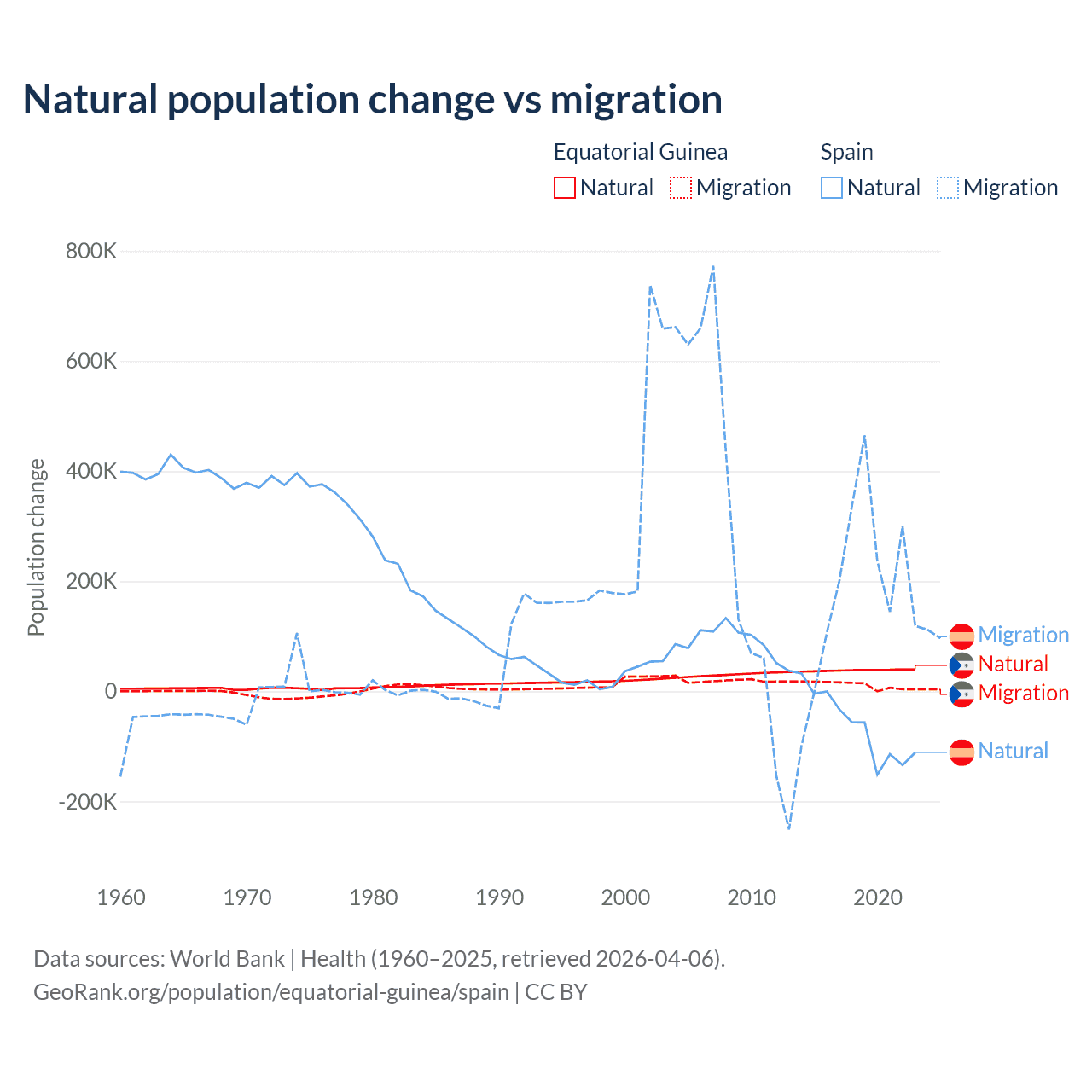 Over the last 10 years, 77% of the population change in Equatorial Guinea is from natural causes (a gain of 382,745 people) and 23% is from migration (a gain of 114,024 people). In Spain 25.8% is from natural causes (a loss of 627,829 people) and 74.2% is from migration (a gain of 1,810,127 people).