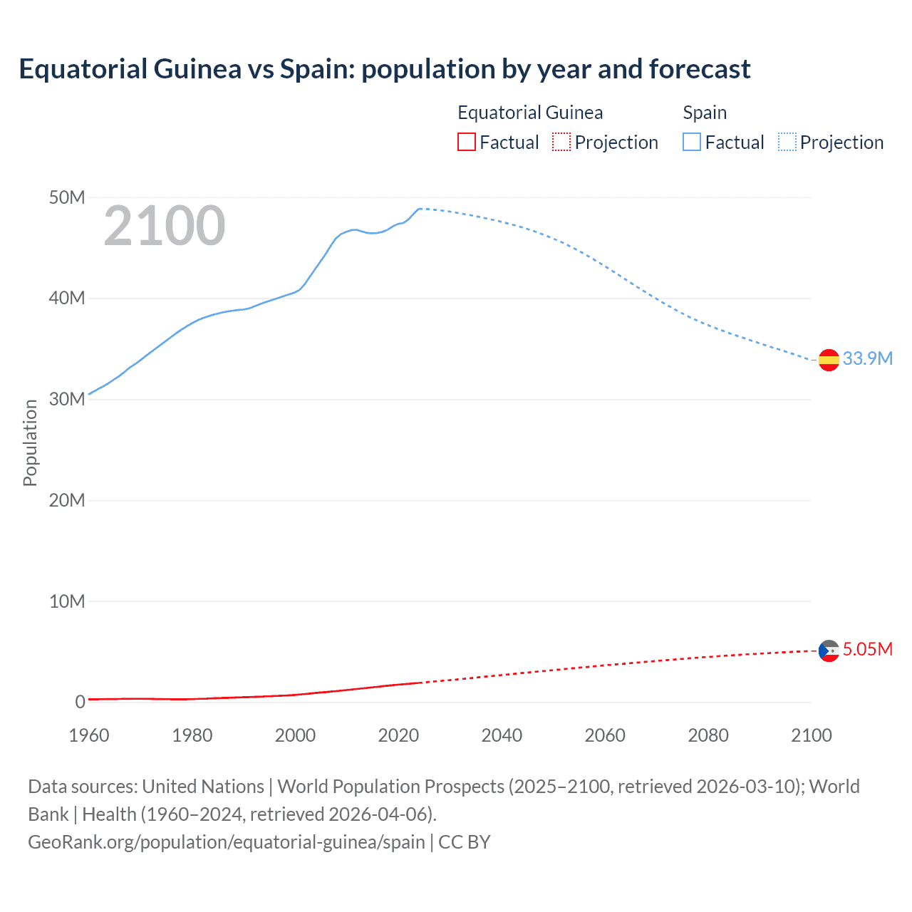 - Since 2006, the population of Equatorial Guinea has increased from 990K people to 2M (101.8% growth), while Spain has grown from 44.4M to 48.8M (9.93% growth).