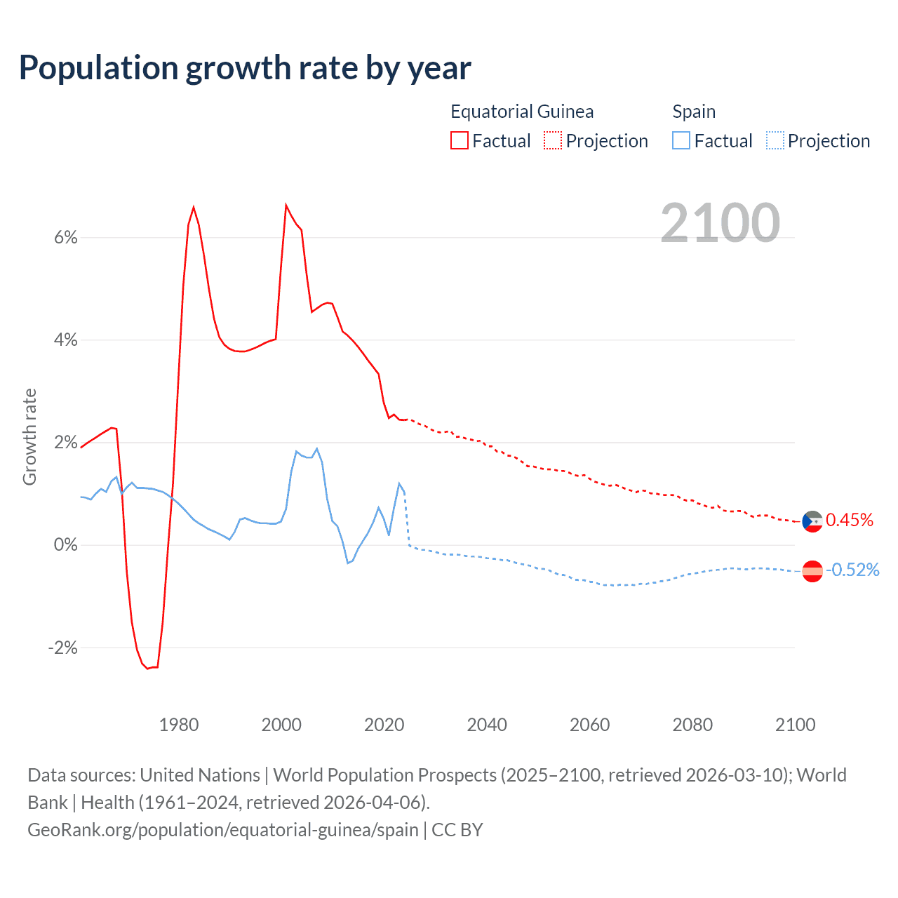 - For the last 10 years, Equatorial Guinea has had an average growth rate of +3.15% per year vs +0.43% in Spain.
