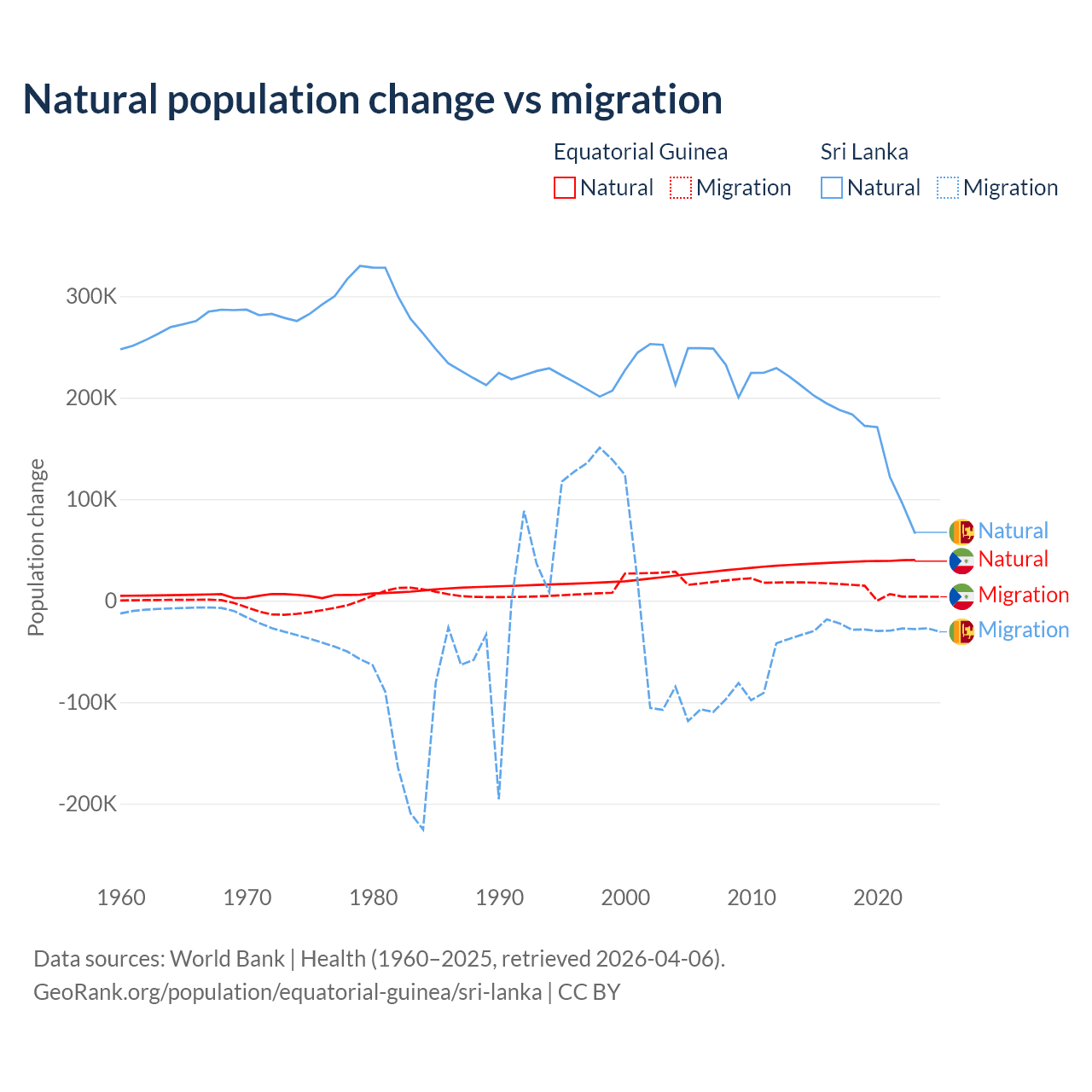 Over the last 10 years, 77% of the population change in Equatorial Guinea is from natural causes (a gain of 382,745 people) and 23% is from migration (a gain of 114,024 people). In Sri Lanka 85.3% is from natural causes (a gain of 1,605,749 people) and 14.7% is from migration (a loss of 276,121 people).
