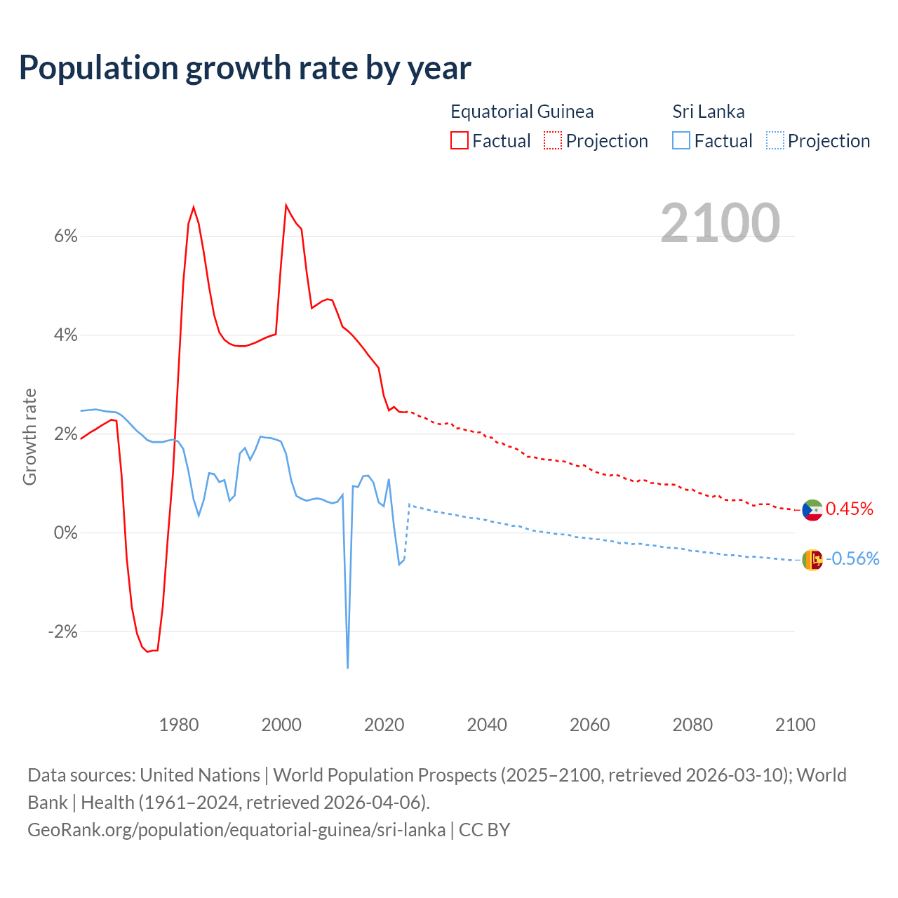 - For the last 10 years, Equatorial Guinea has had an average growth rate of +3.15% per year vs +0.57% in Sri Lanka.