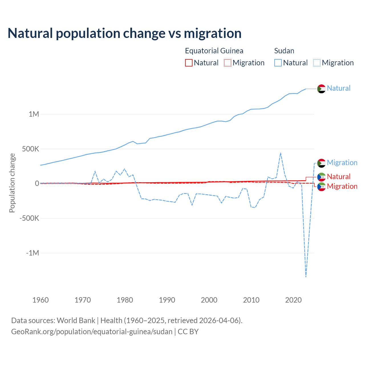 Over the last 10 years, 77% of the population change in Equatorial Guinea is from natural causes (a gain of 382,745 people) and 23% is from migration (a gain of 114,024 people). In Sudan 95.1% is from natural causes (a gain of 12,459,977 people) and 4.88% is from migration (a loss of 639,596 people).