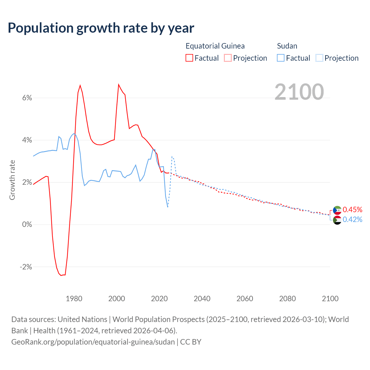 - For the last 10 years, Equatorial Guinea has had an average growth rate of +3.15% per year vs +2.67% in Sudan.