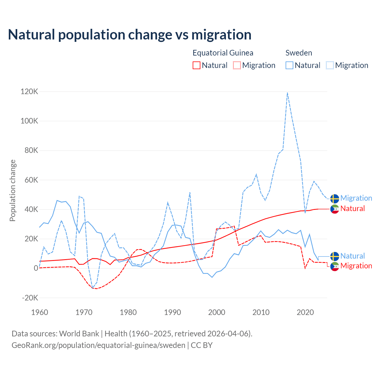 Over the last 10 years, 77% of the population change in Equatorial Guinea is from natural causes (a gain of 382,745 people) and 23% is from migration (a gain of 114,024 people). In Sweden 21.4% is from natural causes (a gain of 201,900 people) and 78.6% is from migration (a gain of 743,642 people).