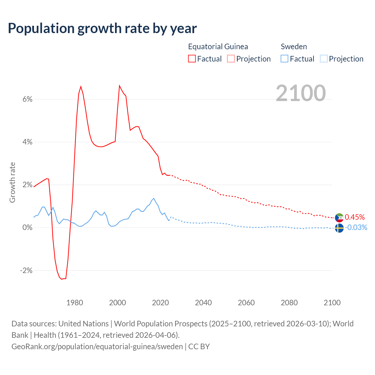 - For the last 10 years, Equatorial Guinea has had an average growth rate of +3.15% per year vs +0.88% in Sweden.