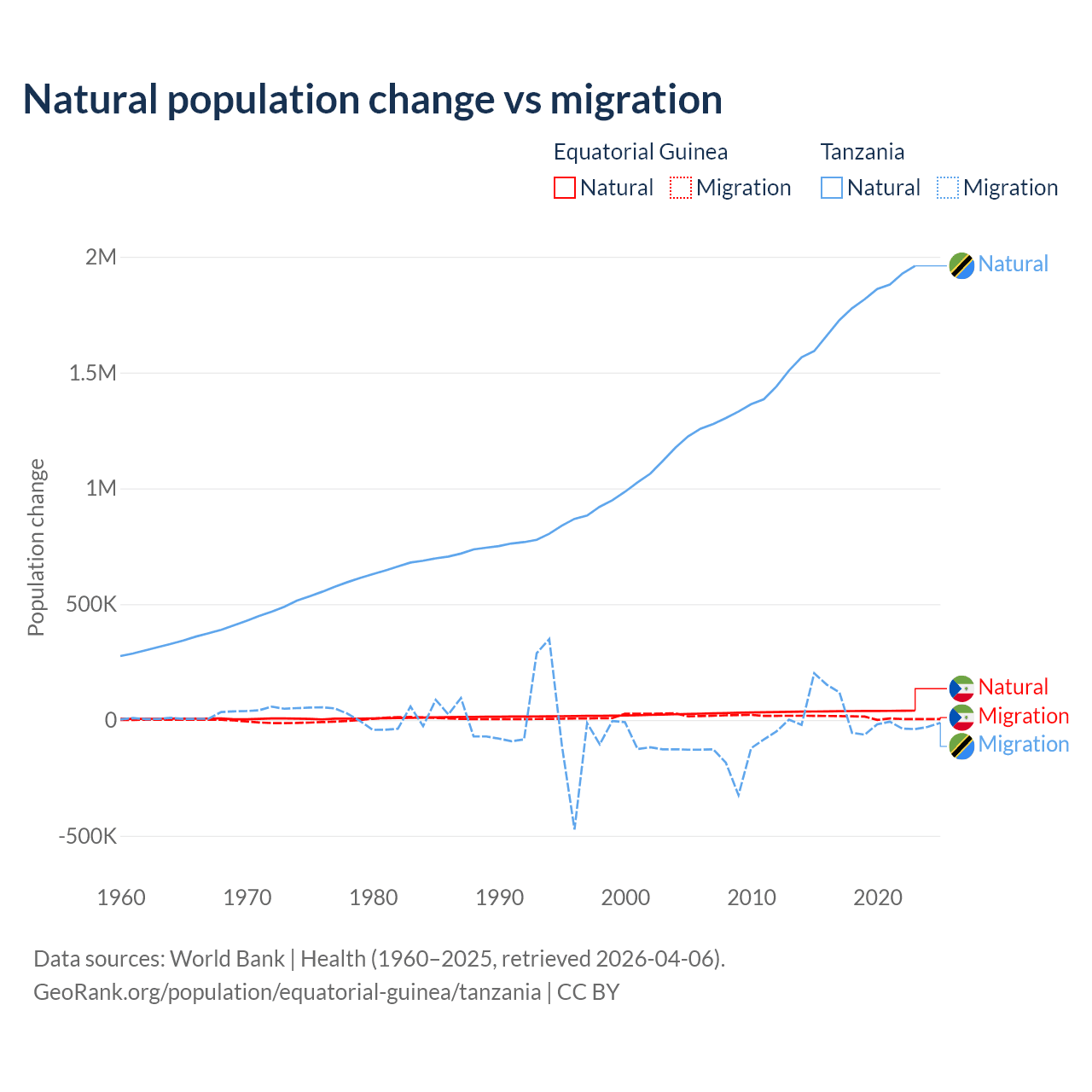 Over the last 10 years, 77% of the population change in Equatorial Guinea is from natural causes (a gain of 382,745 people) and 23% is from migration (a gain of 114,024 people). In Tanzania 98.7% is from natural causes (a gain of 17,769,541 people) and 1.27% is from migration (a gain of 229,466 people).
