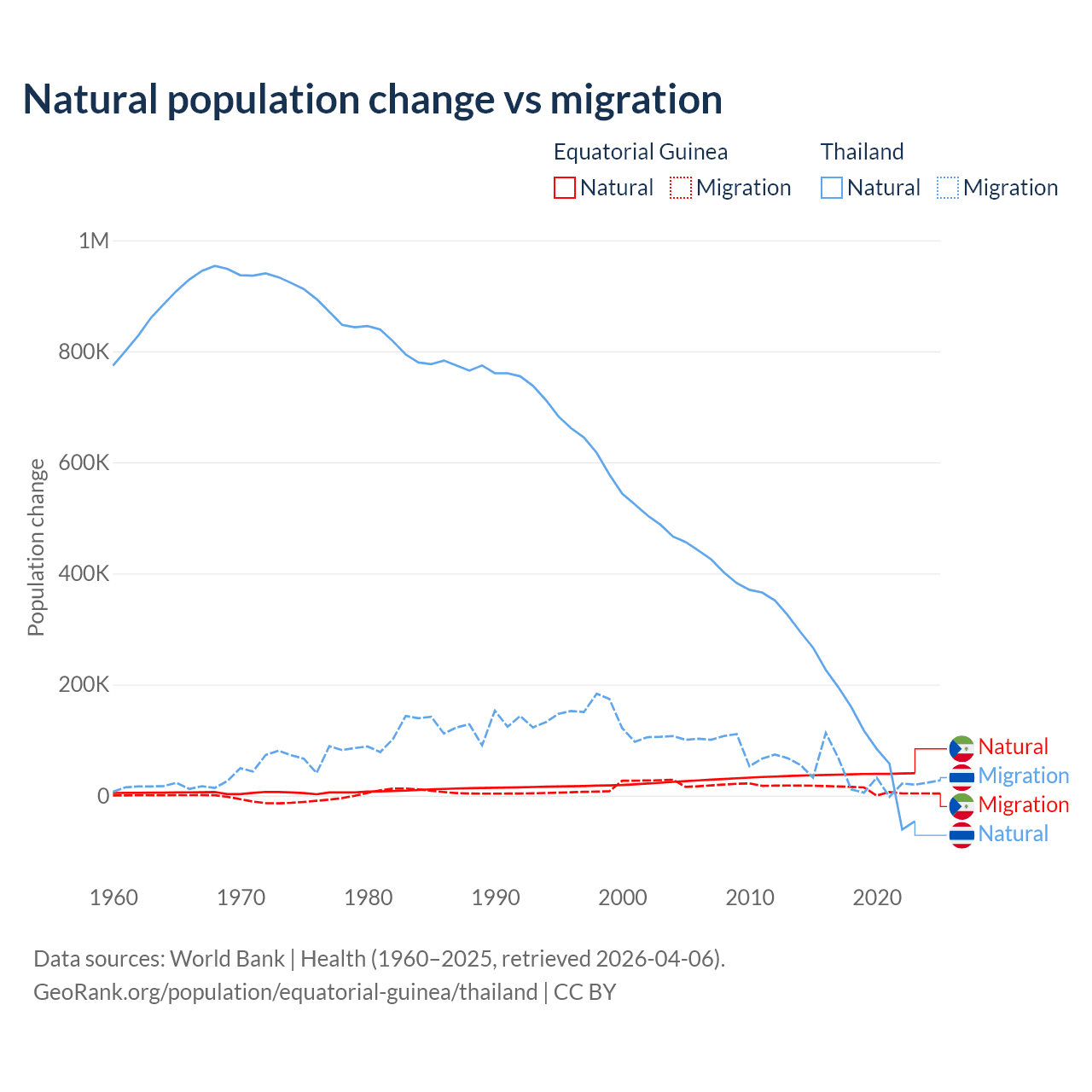 Over the last 10 years, 77% of the population change in Equatorial Guinea is from natural causes (a gain of 382,745 people) and 23% is from migration (a gain of 114,024 people). In Thailand 78.4% is from natural causes (a gain of 1,292,528 people) and 21.6% is from migration (a gain of 355,361 people).