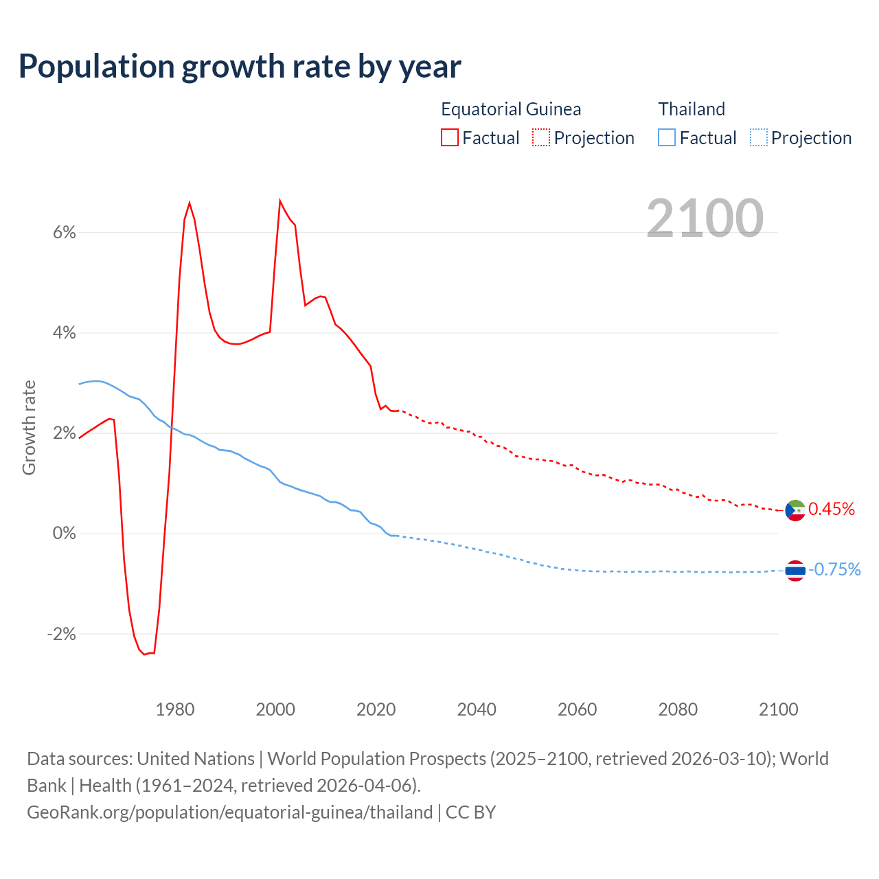 - For the last 10 years, Equatorial Guinea has had an average growth rate of +3.15% per year vs +0.23% in Thailand.