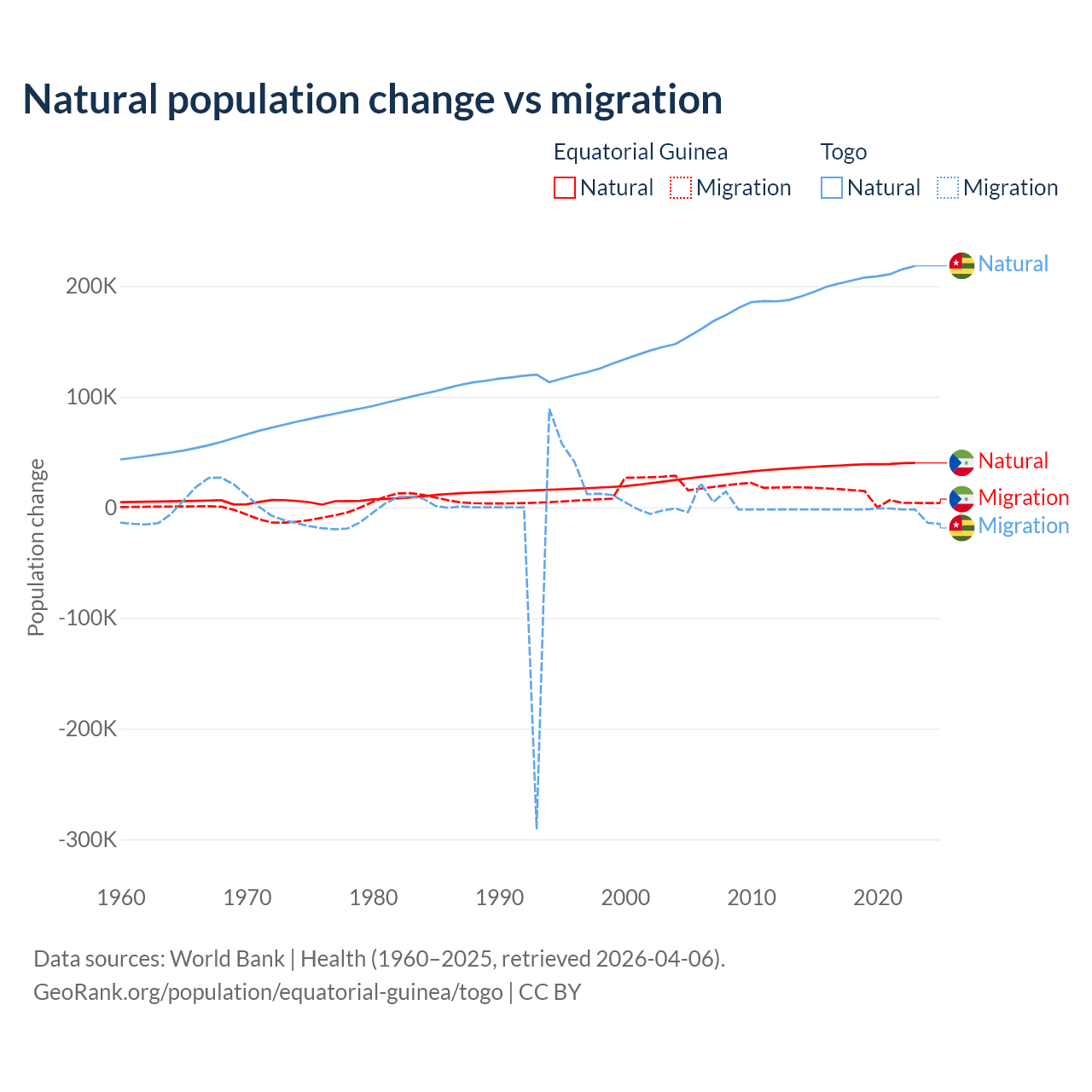 Over the last 10 years, 77% of the population change in Equatorial Guinea is from natural causes (a gain of 382,745 people) and 23% is from migration (a gain of 114,024 people). In Togo 99.1% is from natural causes (a gain of 2,052,115 people) and 0.86% is from migration (a loss of 17,852 people).