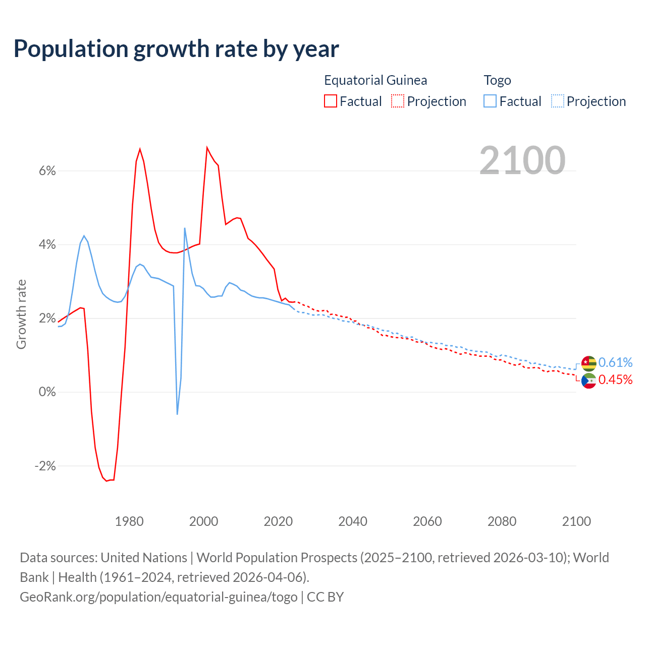 - For the last 10 years, Equatorial Guinea has had an average growth rate of +3.15% per year vs +2.46% in Togo.