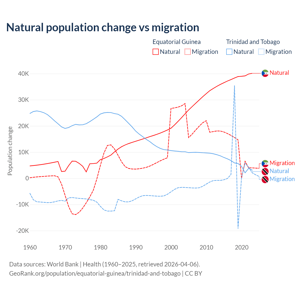 Over the last 10 years, 77% of the population change in Equatorial Guinea is from natural causes (a gain of 382,745 people) and 23% is from migration (a gain of 114,024 people). In Trinidad and Tobago 66% is from natural causes (a gain of 55,887 people) and 34% is from migration (a gain of 28,785 people).