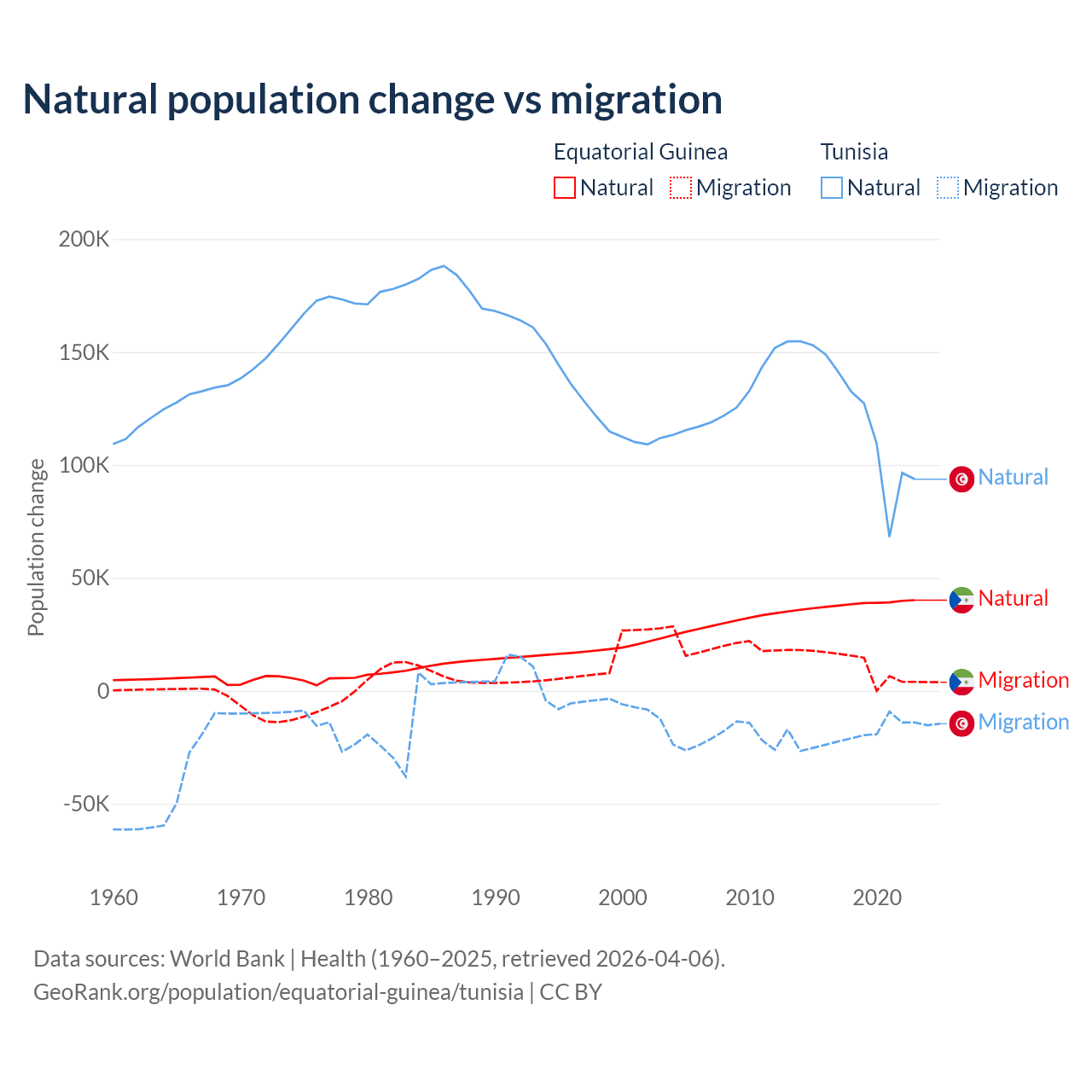 Over the last 10 years, 77% of the population change in Equatorial Guinea is from natural causes (a gain of 382,745 people) and 23% is from migration (a gain of 114,024 people). In Tunisia 86.3% is from natural causes (a gain of 1,225,079 people) and 13.7% is from migration (a loss of 195,011 people).