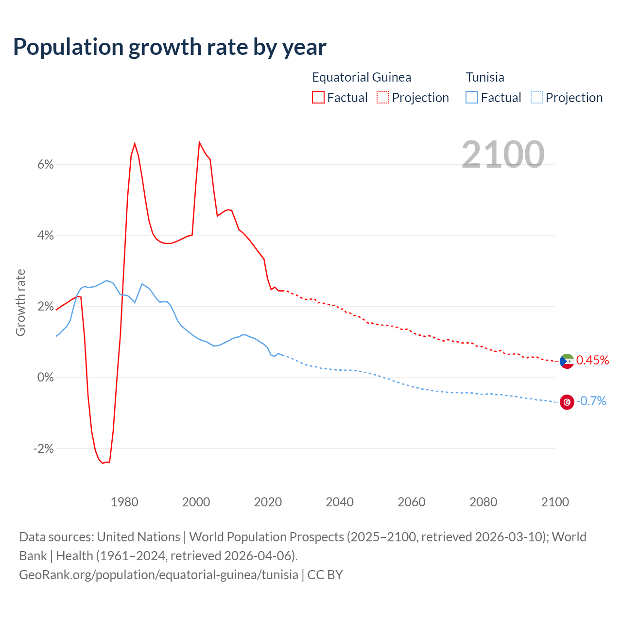 - For the last 10 years, Equatorial Guinea has had an average growth rate of +3.15% per year vs +0.89% in Tunisia.