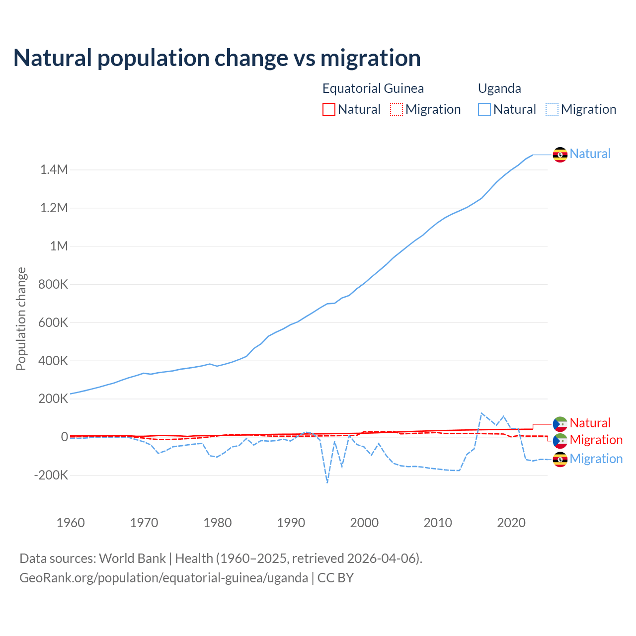 Over the last 10 years, 77% of the population change in Equatorial Guinea is from natural causes (a gain of 382,745 people) and 23% is from migration (a gain of 114,024 people). In Uganda 99.5% is from natural causes (a gain of 13,419,712 people) and 0.53% is from migration (a gain of 71,457 people).